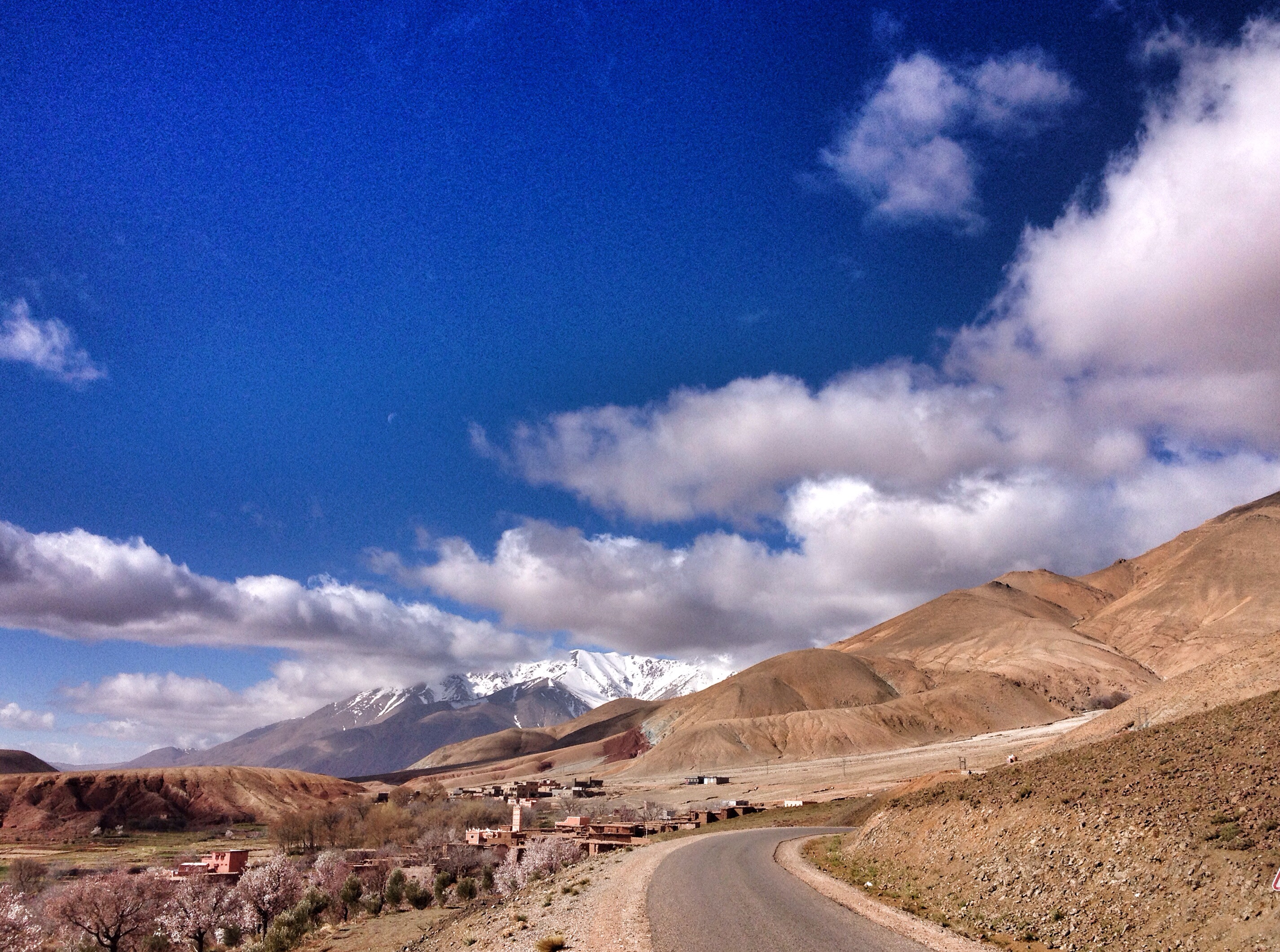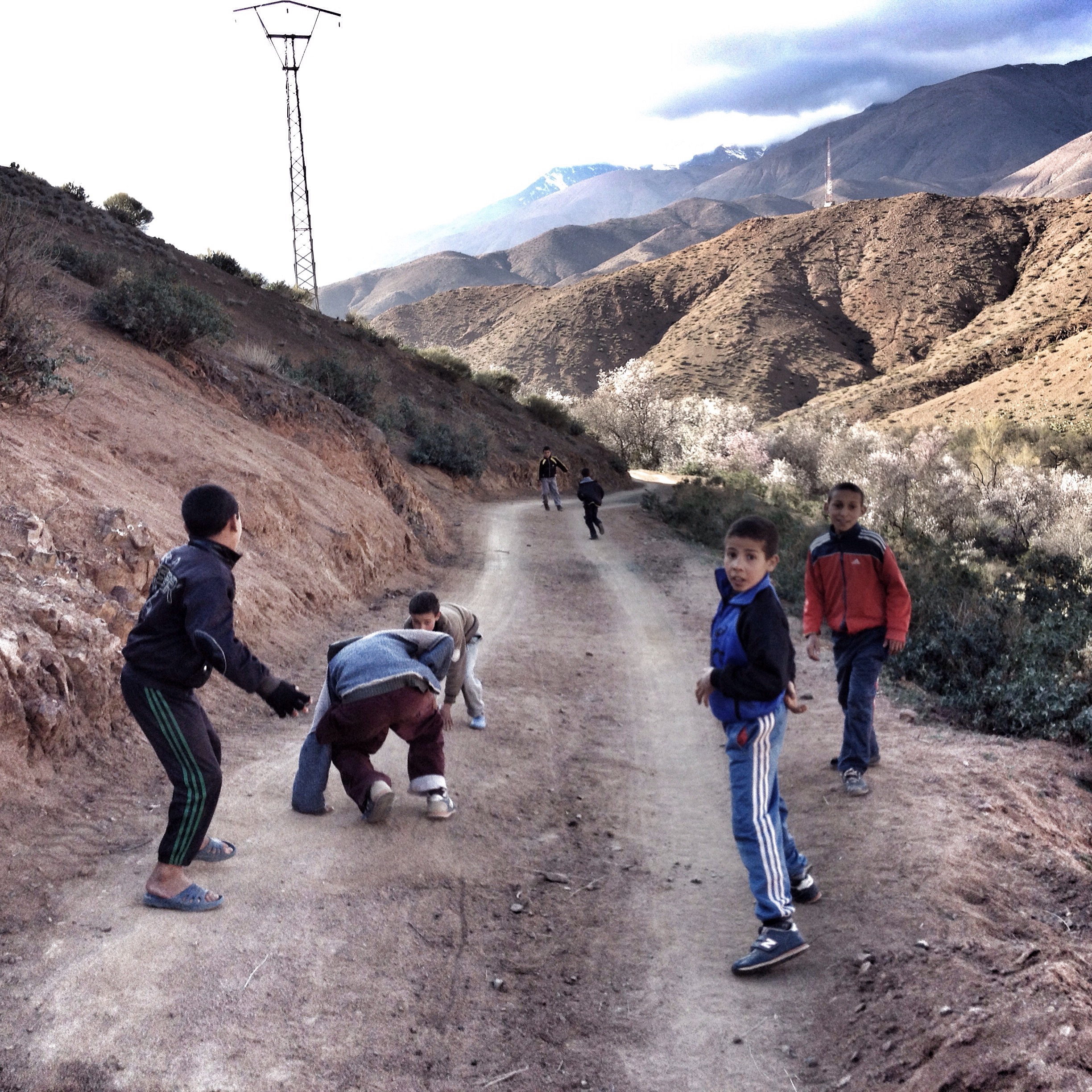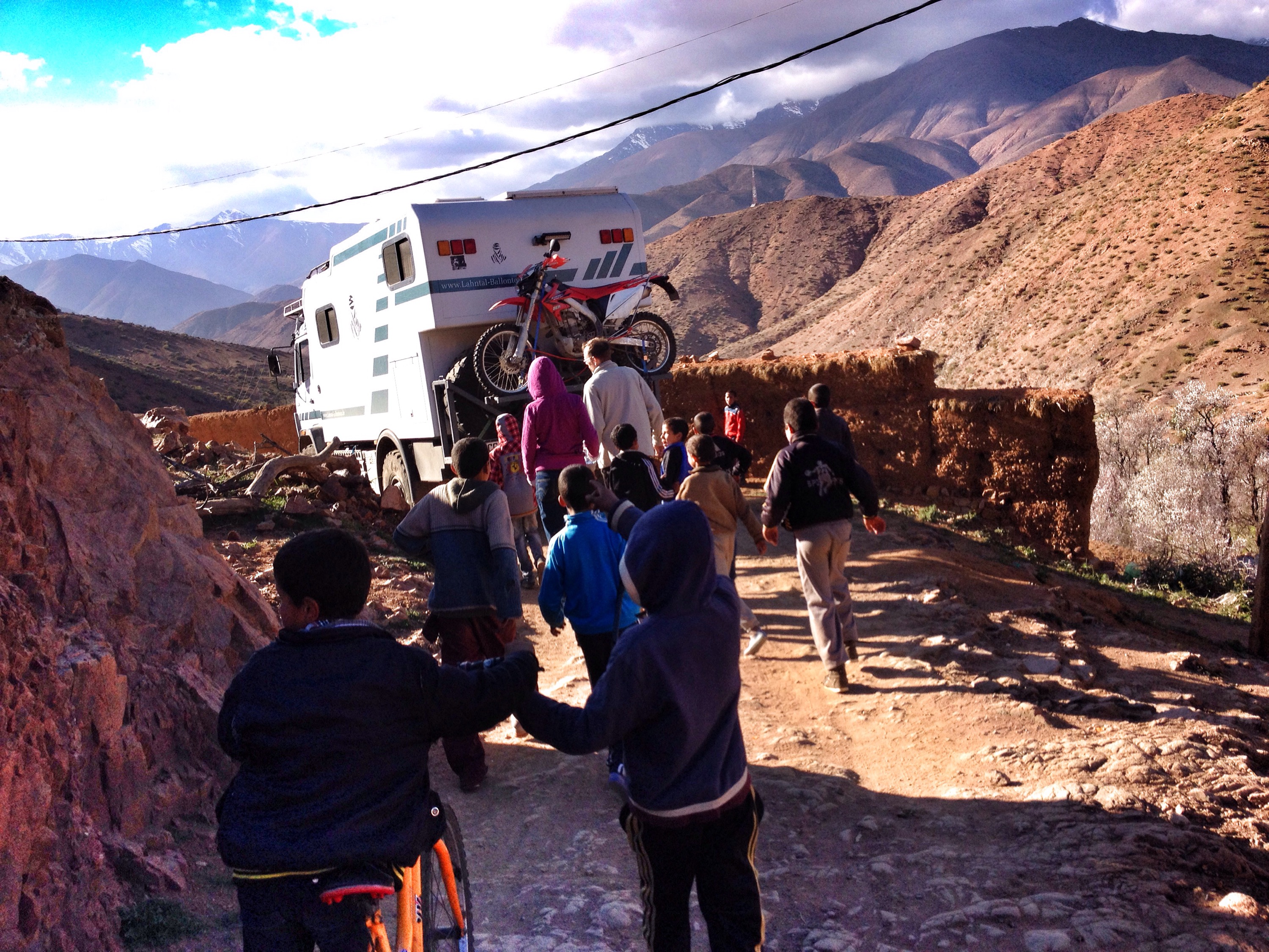 a pleasant easy journey, through majestic valleys, filling up our tank with freshest atlas water at a spring, we ventured off-road, into a garden eden, flanked by large cactus and rich blooming almond trees, towards anmid, when suddenly the soft red iron laden earth broke underneath our right back wheel towards an abyss. claas pulled truck and passengers out of that hole into safety. reaching the village, thirty something kids greeted and followed us back down and out of a road that was unfit for a ten ton four-wheeler. three adults walked beside, in front of and behind the vehicle to warn claas of skinny paths, rock walls to limit the damage. it was a true three hour adventure for us on a one kilometer stretch and we were the excitement of anmid. a campfire, soft tunes, well-deserved cold beer, perfect steak du boef with salad finished the grand day of little kilometers, yet memorable experience.